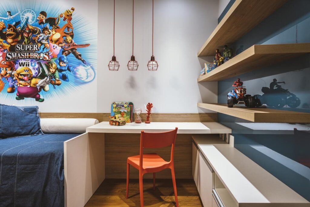 A iluminação é um aspecto que, muitas vezes, passa despercebido, mas que é fundamental tanto para a segurança visual quanto para o bem-estar no dia a dia. A arquiteta Daiane Antinolfi criou um projeto que une funcionalidade e estética, usando tons de azul e detalhes vibrantes, como a cadeira laranja e o painel temático na parede.