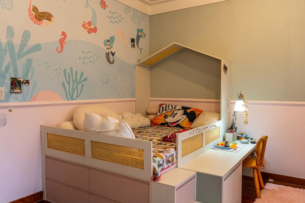Segurança e funcionalidade não precisam eliminar o fator diversão. O arquiteto Marcos Serrano Miralles apostou na marcenaria personalizada para criar uma cama em formato de casinha, com laterais protegidas e gavetões frontais. O projeto ainda inclui uma mesinha de estudos, tudo na altura ideal para evitar quedas e incentivar o uso independente. Esses detalhes lúdicos despertam a imaginação e tornam o quarto um verdadeiro cenário de descobertas e brincadeiras — essencial para o desenvolvimento emocional e cognitivo.