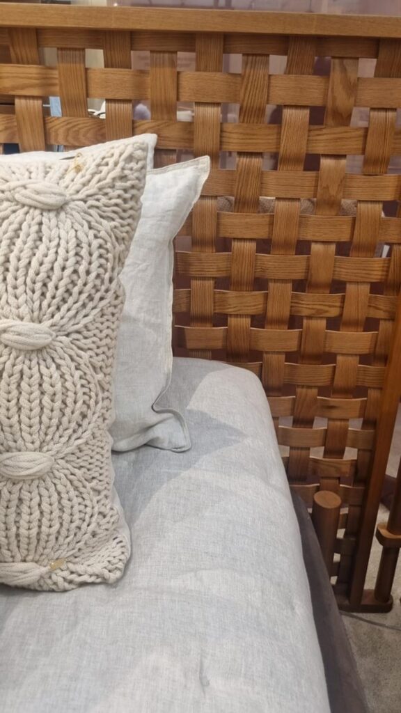 A madeira surge como protagonista, especialmente em lâminas naturais e tons mais quentes, criando atmosferas acolhedoras e envolventes. Tecidos de apelo natural, como linho, bouclês de algodão, couro, camurça e suedes mais encorpados, reforçam a busca por conforto tátil. Tramas largas, tecidos mesclados e almofadas em tricô e crochê evidenciam a valorização do feito à mão e da brasilidade.