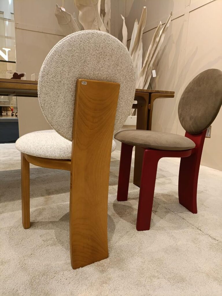 A cor deixa de ser coadjuvante e assume protagonismo no mobiliário. Além das mesas de apoio, surgem cadeiras de design retrô-moderno com acabamentos em laca colorida. Tons de vinho e bordô aparecem de forma intensa em móveis e estandes, muitas vezes combinados a superfícies de alto brilho e acabamentos hi-gloss.