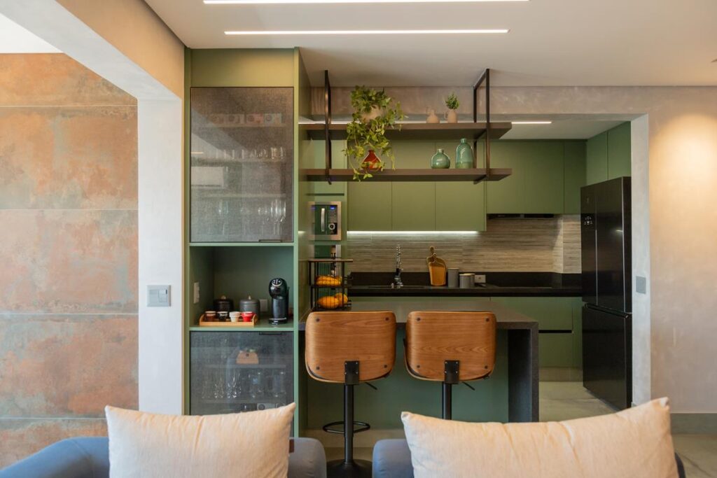 Na área social, os elementos que os clientes gostam – o concreto aparente e o aço corten -, foram utilizados nas paredes, criando harmonia e personalidade. Na cozinha, a marcenaria verde, junto aos metais e eletros pretos, imprime requinte e complementam a paleta de cores escolhida para o local.