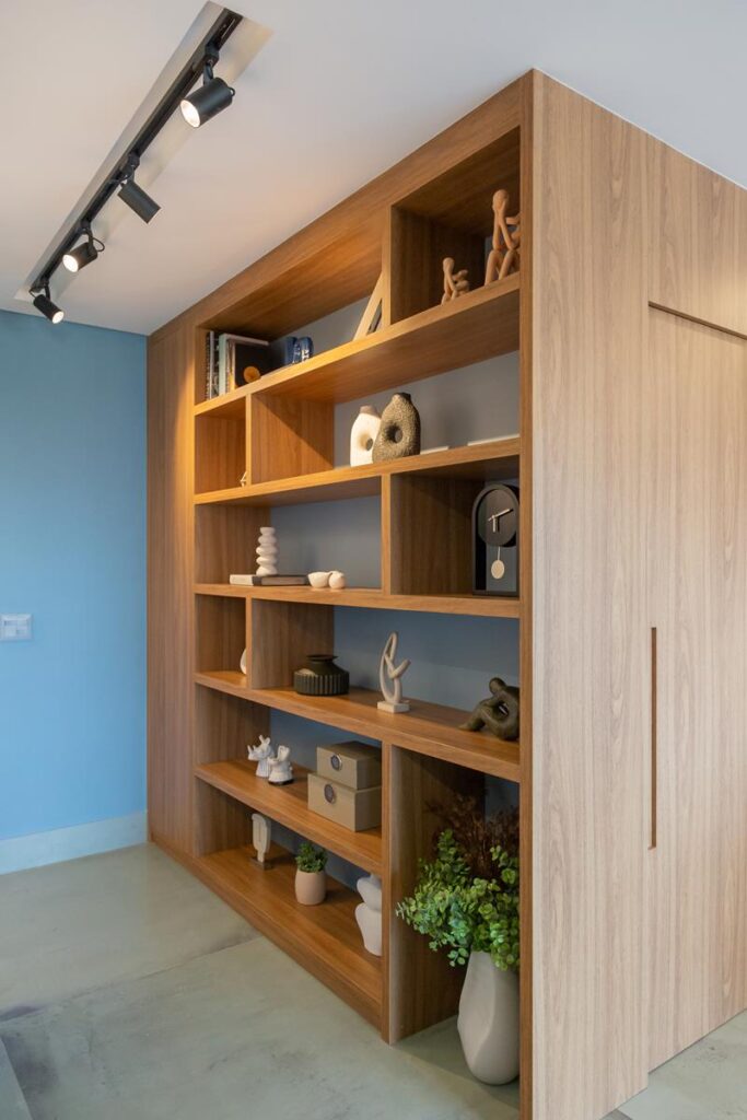 A estante divisória, na entrada do imóvel, é um dos destaques do projeto. Além de compor o design, funcionou como elemento arquitetônico divisório, delimitando o Home Office, garantindo, dessa maneira, privacidade visual e mantendo a estética integrada.