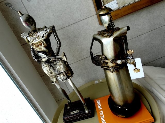 O talento do artista plástico Pithon é responsável pela produção de peças singulares, criadas a partir de matérias-primas como zinco galvanizado, alumínio, inox e ferro. São colheres, calota de carro, raquete de tênis, estrado de cama de ferro, brincos, tampas de alumínio, e madeira (usada como suporte das peças) que, minunciosamente trabalhadas, são transformadas em belos artigos decorativos.