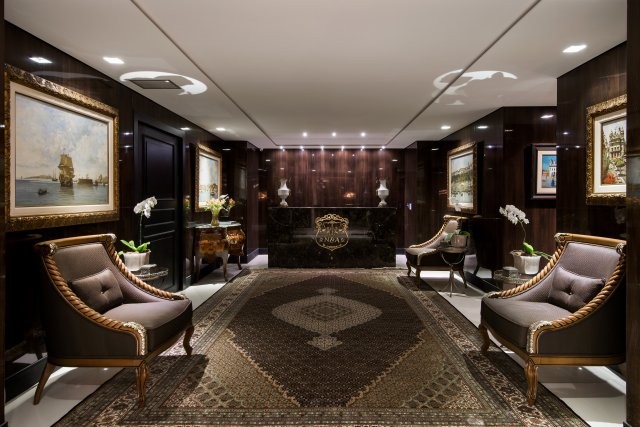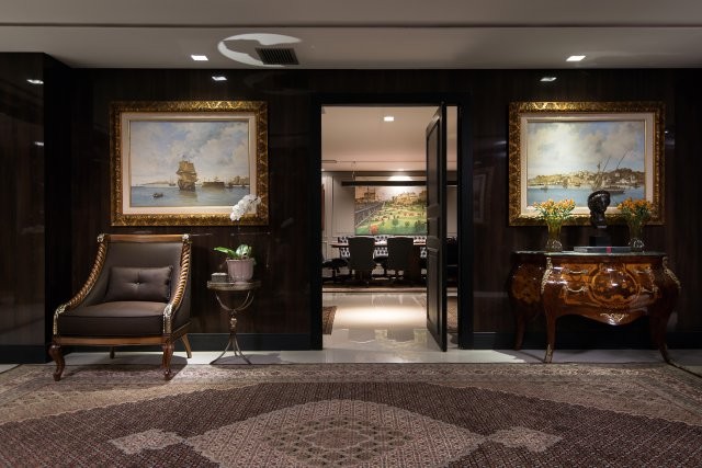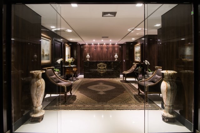 O pavimento de 700 m² recebeu um hall com elevadores privativos completamente novo. No piso, grandes placas de mármore Bege Bahia com detalhes em mármore marrom imperial. As paredes foram revestidas com painéis de madeira e adornadas com arandelas decorativas. A intenção do escritório era conduzir o visitante até à recepção com todo o requinte que ele merece. A entrada do escritório pode ser vista após abrir grandes portas automatizadas, feitas com vidro laminado. Assim, de acordo com a MM8, o visitante pode sentir a importância, robustez e tradição do escritório.