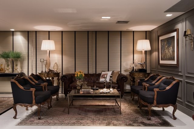 Seguindo o estilo clássico, a paleta cromática desses espaços segue tons austeros: os marrons no mobiliário com detalhes em capitonê, marchetaria e torno, o cinza das boiseries e o dourado nos adornos e na cortina.