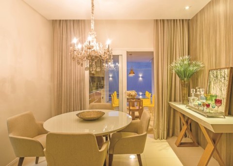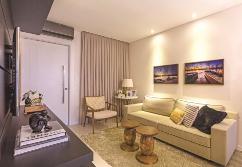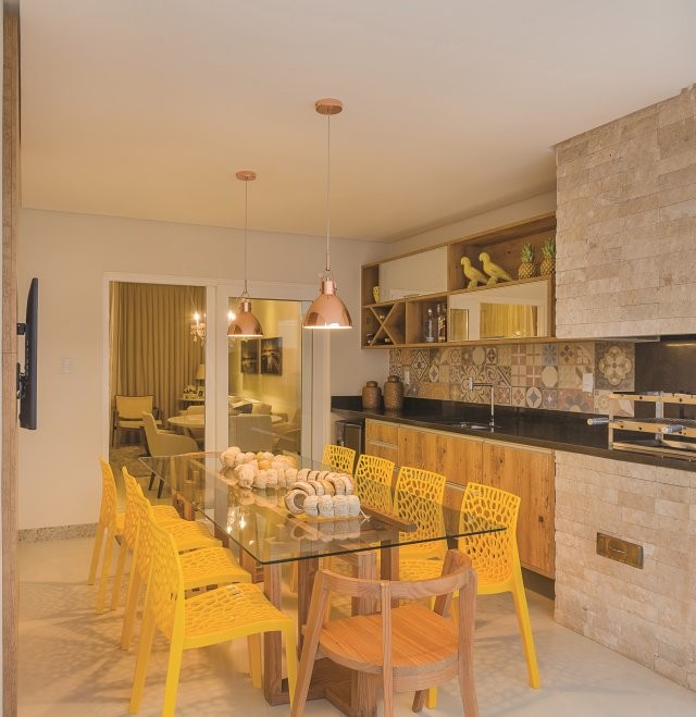 Pensamos, para este projeto, ambientes internos em tons neutros nas cores bege e marrom, mesclados em mobiliários e objetos de decoração que passeiam entre clássicos e contemporâneos, utilizando-se de elementos como a madeira e o linho, dando assim o ar de aconchego e sofisticação. Já para a varanda gourmet, pensamos em um ambiente mais alegre, para qual definimos junto aos proprietários a predominância do amarelo, deixando a área mais despojada e receptiva.