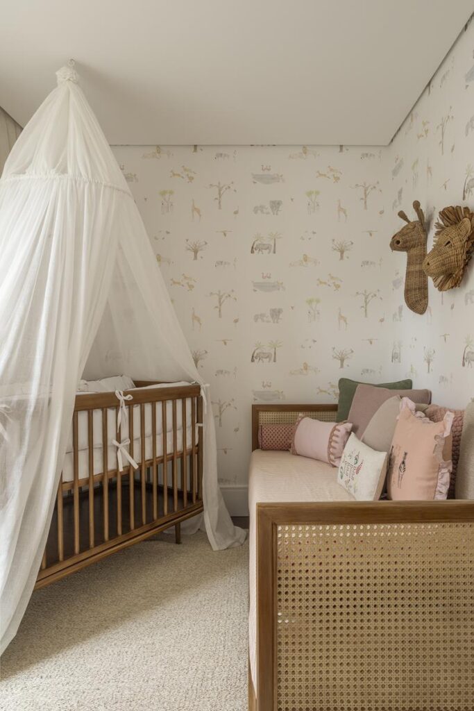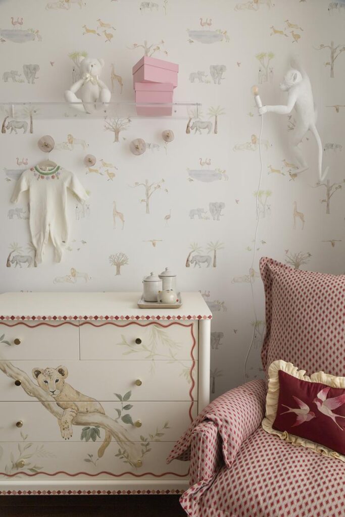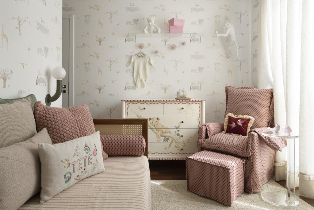 A paleta em cores pastel estabelece a base do projeto, trazendo leveza e criando um espaço que abraça e inspira. O papel de parede de Melanie Sonnenfeld reveste todas as paredes, ampliando visualmente o ambiente e trazendo profundidade ao espaço, com um desenho de animais que se repetem e constroem esse cenário contínuo.