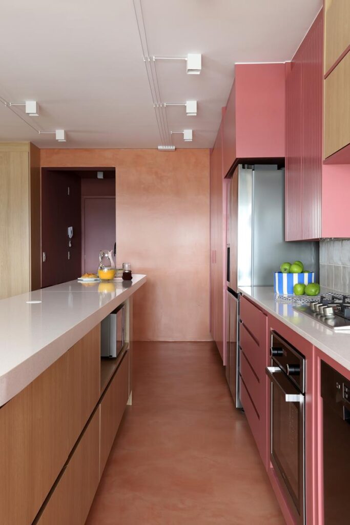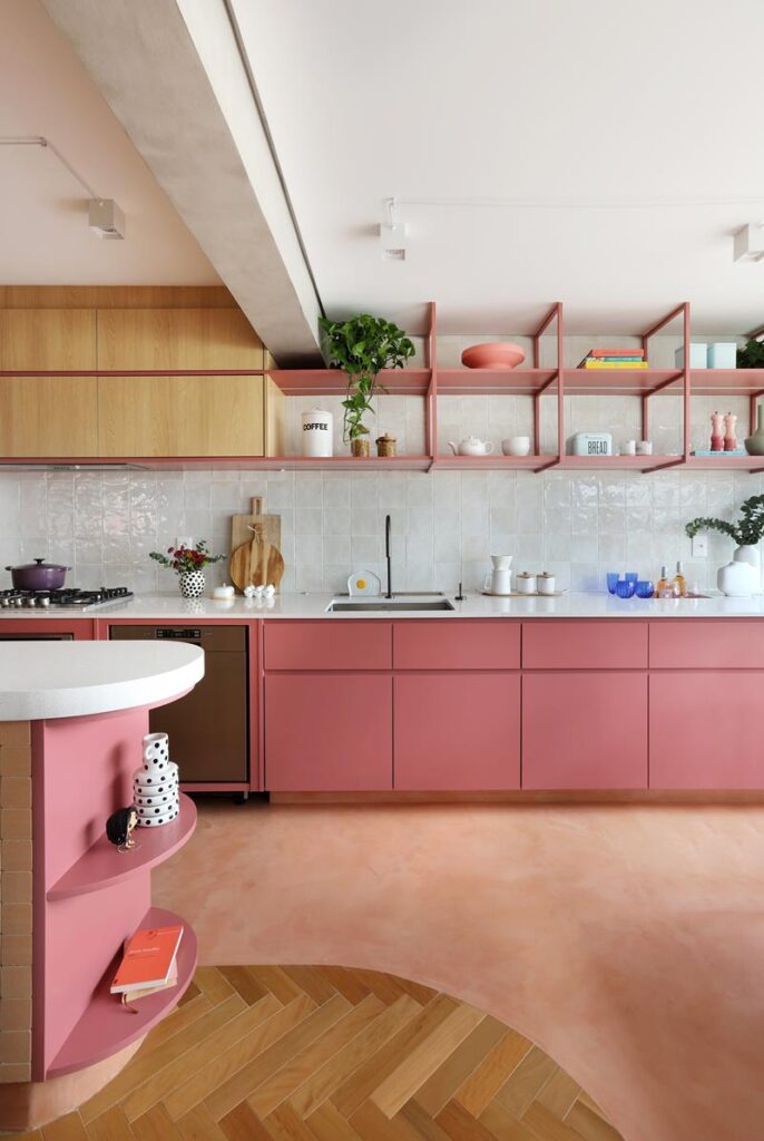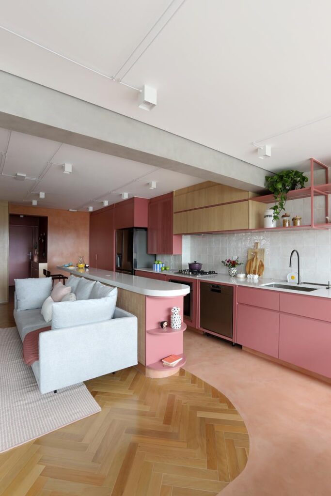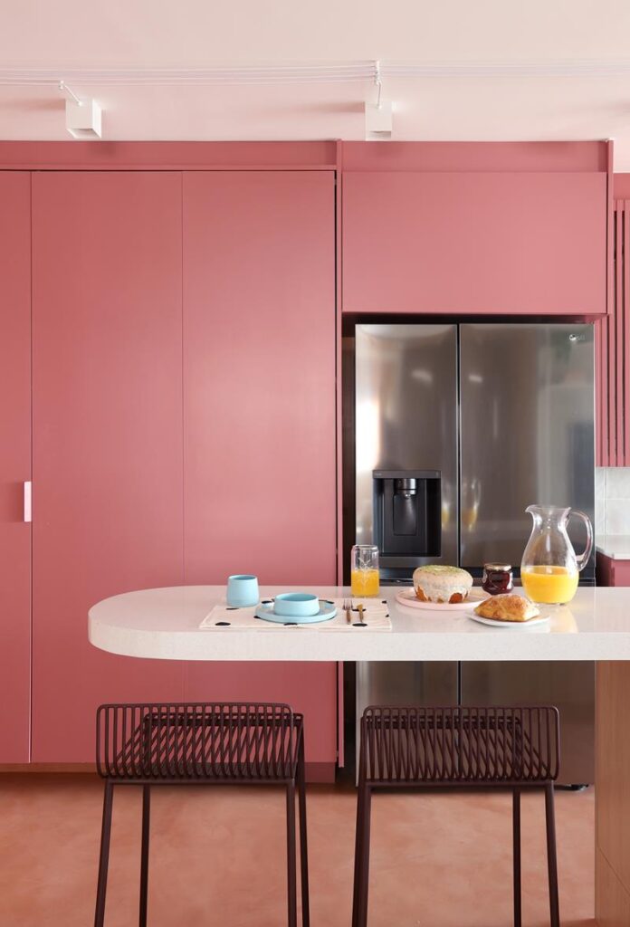 Para chocar, a cozinha integrada à área social do apartamento é toda cor de rosa! A marcenaria foi revestida com acabamento em laca cor Salão Rosa, a serralheria e as prateleiras receberam o mesmo tom. Armários suspensos em MDF Carvalho da Arauco têm detalhes com frisos na cor rosa. O piso, com paginação diferente (curvo e em movimento) para delimitar os ambientes. No piso da cozinha, foi usado o microcimento na cor Terracota, o mesmo acabamento usado em uma das paredes do ambiente, criando a sensação de continuidade. O mesmo piso segue em direção à varanda integrada ao espaço e acomodando a mesa de jantar com a mesa, cujo tampo desenhado pelo próprio Studio 92 é em Quartzito Negroni.