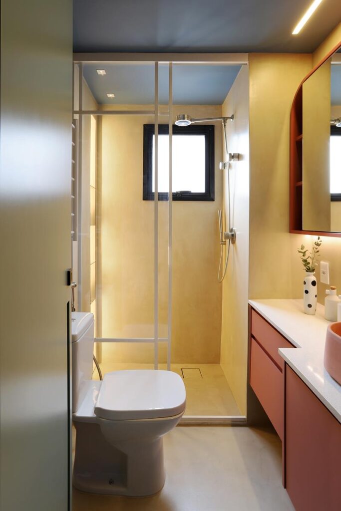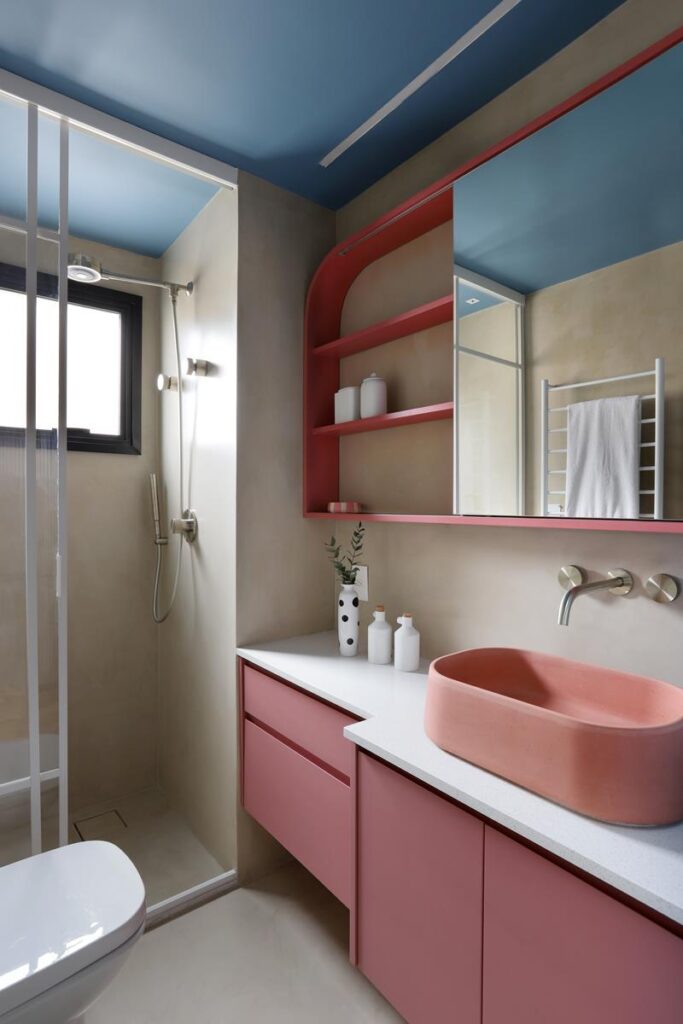O banheiro da suíte tem cores variadas, sempre em perfeita harmonia e combinação. A começar pela porta em marcenaria na mesma cor verde usada no armário do quarto e azul Tarde em Veneza da Coral lado de dentro para acompanhar o mesmo tom usado no teto. A bancada em Silestone branca com cuba em concreto rosa queimado, armários inferiores com acabamentos em rosa e moldura em rosa no armário/espelho.
