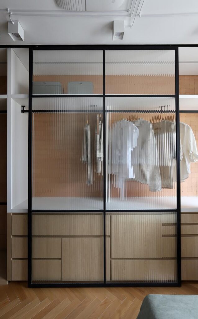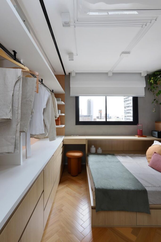 A suíte foi projetada com um sistema inteligente de marcenaria para otimizar espaço e armazenamento de peças pessoais, calçados e vestimentas.