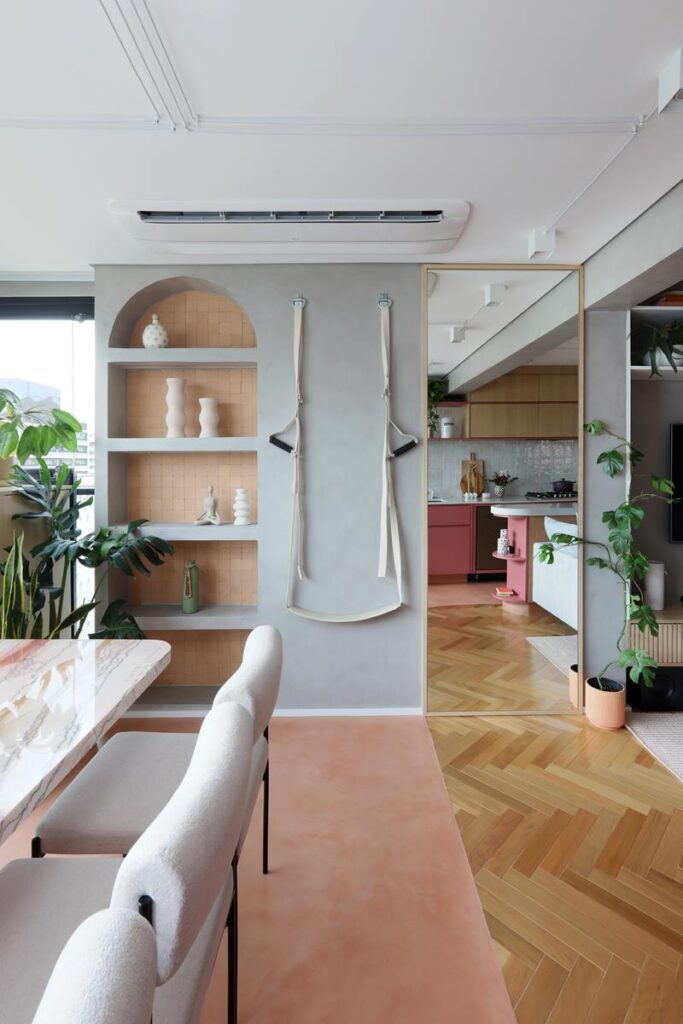 Ainda na sala, a moradora, adepta ao yoga e outras práticas meditativas e exercícios funcionais, solicitou um espaço especial para seu hobby. O Studio 92 Arquitetura reservou uma parede para instalar o equipamento para os exercícios.