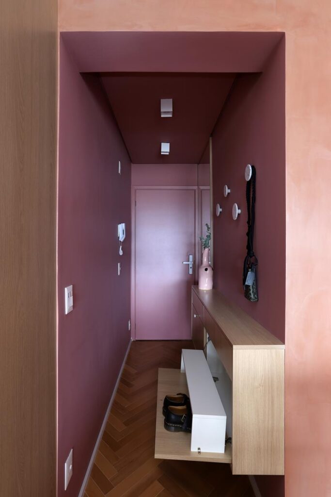 A premissa foi usar cores neste projeto com predominância do rosa e suas diversas tonalidades para criar ambientes femininos e delicados. Logo na entrada, o Studio 92 Arquitetura criou um hall color block rosa escuro e criou um móvel em madeira revestido com MDF Carvalho da Arauco (sapateira e aparador), projetado na parede para ser um ponto de destaque no espaço, totalmente, cor de rosa. Na mesma parede, penduradores em diferentes pedras naturais, para pendurar bolsa e casacos. A porta de entrada do apartamento foi laqueada no mesmo tom de rosa das paredes.