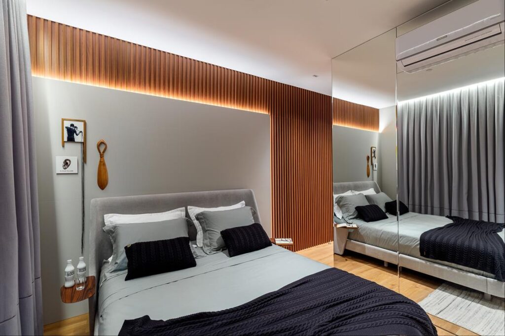 As quatro suítes repetem a linguagem visual do projeto, com painéis ripados em madeira clara, estofados em bouclé, mantas de tricô e iluminação suave. Em uma delas, a composição sobrepõe duas mantas de tricô em pontos diferentes, criando uma sensação de camadas e conforto visual.