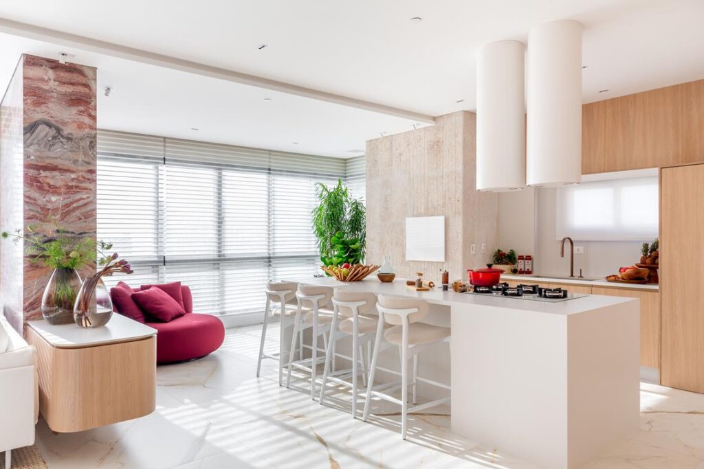 A cozinha integrada é um dos pontos centrais do projeto e foi executada com bancadas e ilha central em ultracompacto Pure White Fosco, material da Tessela, de alta resistência a manchas, calor e umidade, tendência no mercado de alto padrão. O acabamento fosco realça a estética leve e minimalista, ao mesmo tempo em que oferece praticidade no uso diário. Duas coifas cilíndricas suspensas em inox completam a composição da ilha, reforçando a simetria do ambiente e trazendo um toque industrial elegante à estética leve e natural da cozinha. Com marcenaria sob medida da Idélli Ambientes, a cozinha traz nichos abertos com iluminação embutida, eletrodomésticos ocultos e acabamento uniforme que conecta visualmente com o living.