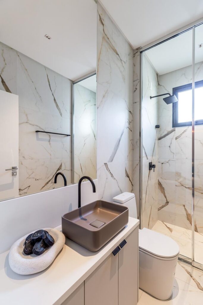 Nos banheiros, o destaque vai para o uso de quartzo Branco Zeus Polido nos revestimentos, que traz luminosidade e leveza. O box de vidro com 10 mm de espessura e sistema antiestilhaço garante segurança e transparência total, um recurso que amplia os espaços e deixa a luz circular com fluidez. As bancadas amplas e metais de alta qualidade completam o desenho contemporâneo com estética de spa.