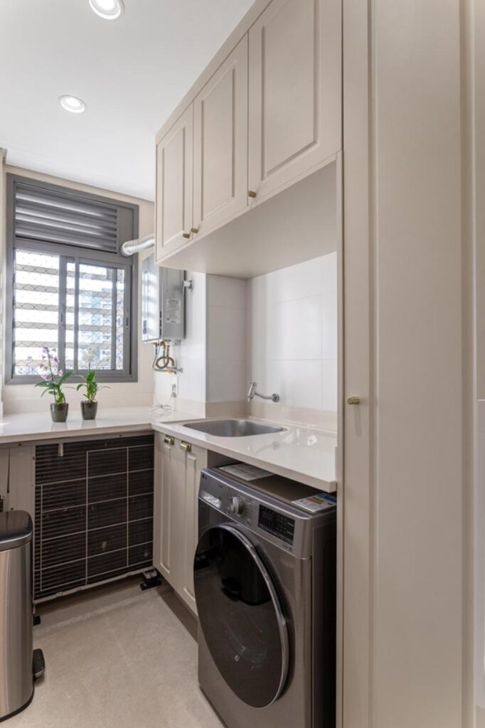 A lavanderia, integrada ao conceito do projeto, mantém o padrão de mobiliário sob medida, com diversos compartimentos e os mesmos puxadores, assegurando unidade visual.
