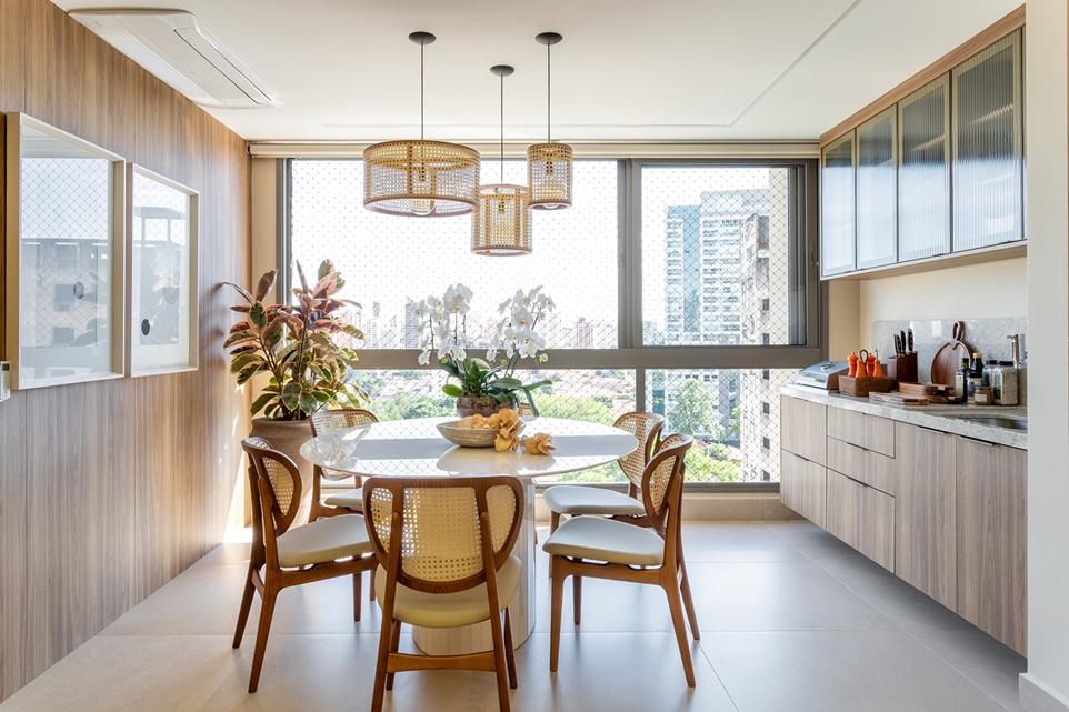 A varanda gourmet se destaca como um dos pontos centrais do projeto. A mesa de jantar redonda é valorizada pelo painel de madeira que reveste a parede ao fundo, criando um cenário acolhedor para as refeições. As cadeiras com detalhes em palhinha no encosto reforçam a sensação de conforto, dialogando com o armário suspenso com vidro frisado e a bancada linear, que abriga pia, churrasqueira e acessórios. O conjunto é finalizado com uma luminária trio suspensa com palhinha, que complementa a atmosfera leve e sofisticada do espaço.