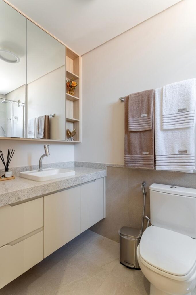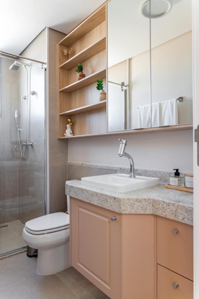 Os banheiros também receberam soluções sob medida, com móveis suspensos que otimizam o espaço. Um deles conta com puxadores cavados e espelhos integrados, enquanto o outro aposta em puxadores circulares delicados e marcenaria em tom de rosa claro. No segundo banheiro, a marcenaria curvada acompanha o mármore da bancada, permitindo a abertura total da porta e garantindo praticidade sem comprometer o design.