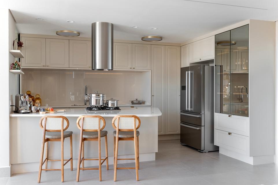 Na cozinha, a proposta segue uma base branca, enriquecida por detalhes em cinza presentes nos eletrodomésticos e nos assentos das banquetas. Os armários com puxadores circulares e côncavos trazem um toque contemporâneo, enquanto a ampla bancada com cooktop e o armário com portas de vidro garantem funcionalidade e organização.