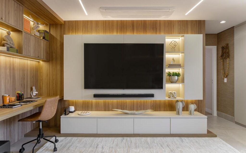 Na sala de estar, o painel da TV se estende pela lateral e dá continuidade a uma área de trabalho integrada, composta por nichos e armários suspensos. A combinação entre tons de madeira e branco confere elegância ao espaço, enquanto os elementos decorativos acrescentam personalidade e identidade ao ambiente.
