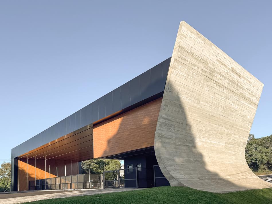 A estrutura apresenta uma forma curva que se eleva a partir do solo, em referência às ondulações dos parreirais característicos da Serra Gaúcha, enquanto o uso de superfícies que remetem à madeira estabelece relação com a indústria moveleira, dois dos principais eixos econômicos da região.