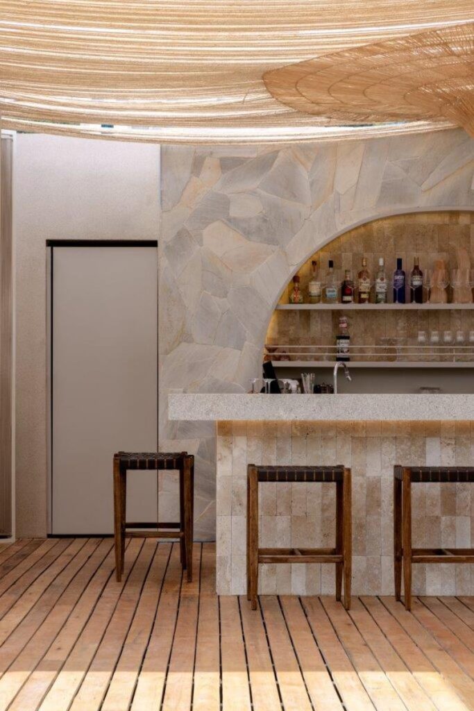 A materialidade desempenha papel central na construção da identidade do projeto. A seleção de materiais buscou equilibrar estética, durabilidade e resistência ao clima litorâneo. A madeira natural aparece na estrutura e no mobiliário, trazendo calor e textura. Revestimentos minerais e pedras reforçam a durabilidade e estabelecem uma conexão direta com a paisagem.