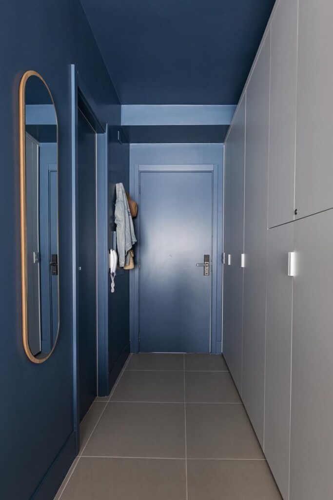 No banheiro, a estratégia foi aproveitar a base da construtora, transformando-o com o uso inteligente de cor. A tinta azul foi aplicada no ambiente inteiro, o que, junto com uma nova iluminação e uma marcenaria bem desenhada, mudou completamente o padrão da entrega original sem precisar de uma reforma pesada.