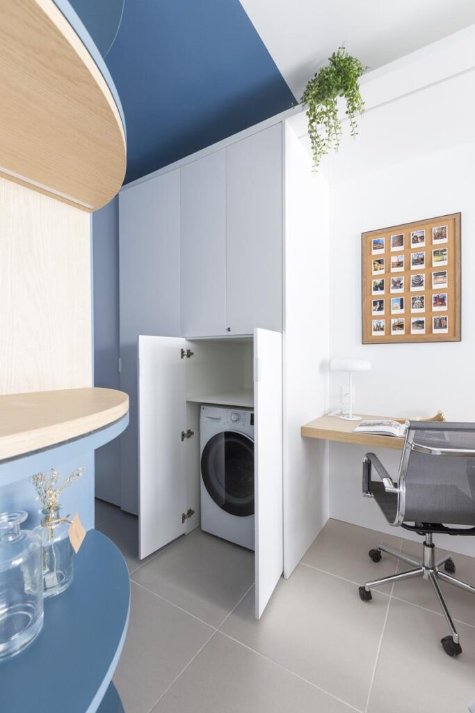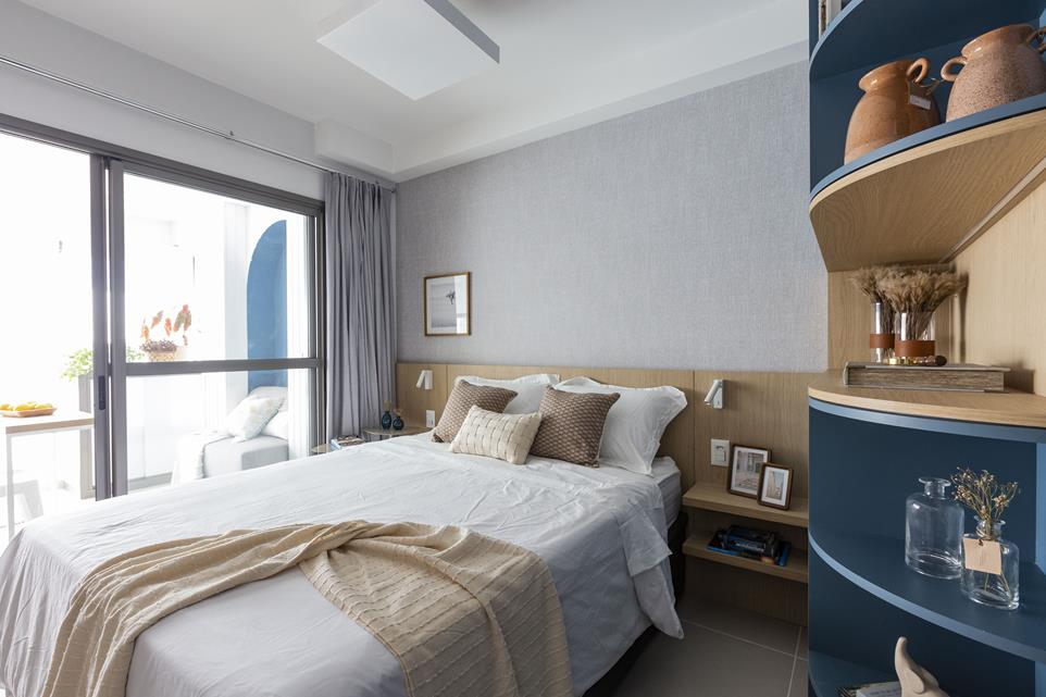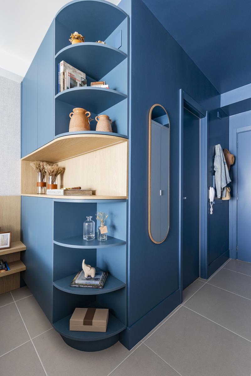 De acordo com as profissionais, o desafio do projeto foi acomodar todas as funções em um espaço compacto, garantindo fluidez e conforto. O destaque, por sua vez, fica com o arco azul na varanda, que imprime um ar lúdico e romântico ao apartamento, contrastando com as linhas predominantemente retas do restante do ambiente.