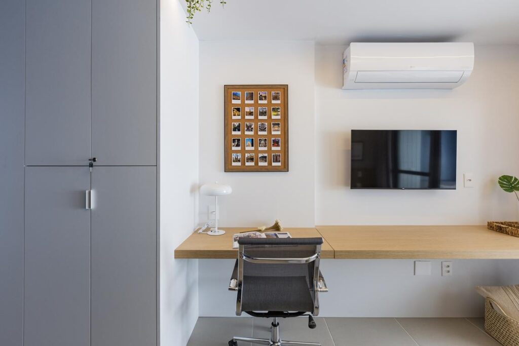 A marcenaria foi a grande aliada do projeto, já que permitiu criar boas soluções funcionais de organização e armazenamento.