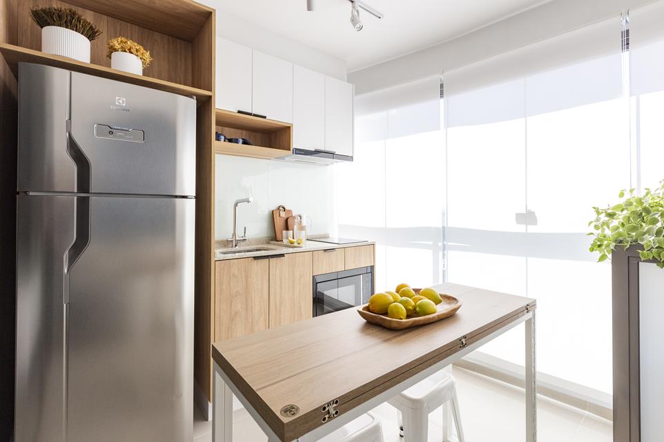 Com pouca metragem, o projeto foi estratégico para que o apê parecesse maior do que realmente é. As arquitetas optaram por manter a porta que divide a varanda da parte interna, separando, dessa maneira, os usos de cada local. Assim, cozinha e o estar foram movidos para a varanda, transformando a parte interna em uma área dedicada ao setor íntimo, composto pelo hall, banheiro e quarto. Essa decisão foi fundamental em um imóvel que pode receber até três pessoas, pois permite boa circulação e independência nos ambientes.