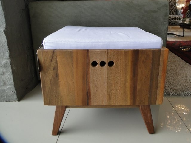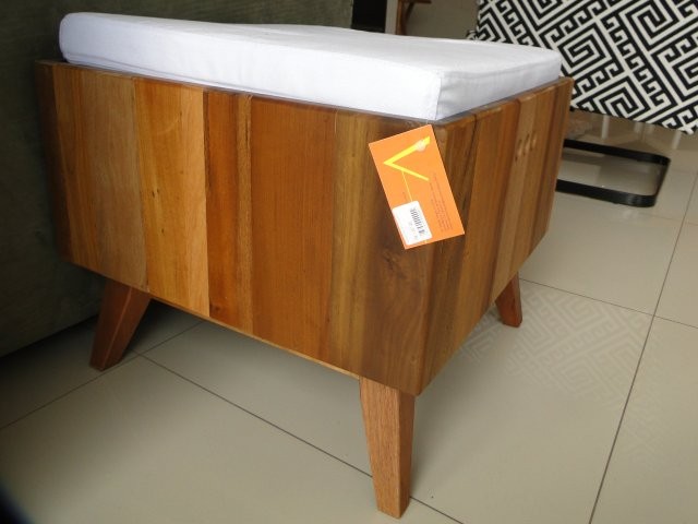 O banco é feito em madeira de lei de demolição em acabamento verniz PU fosco, com opção de estampas, e além de vir com uma confortável almofada, ainda possui o plus: um baú, próprio para guardar objetos e economizar espaço.
