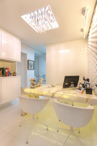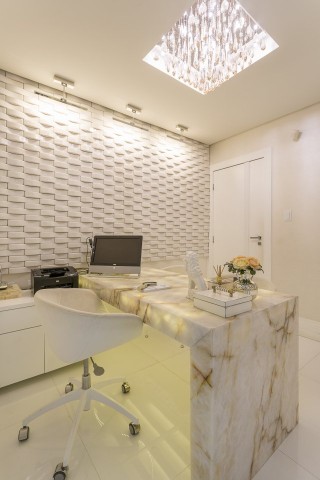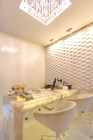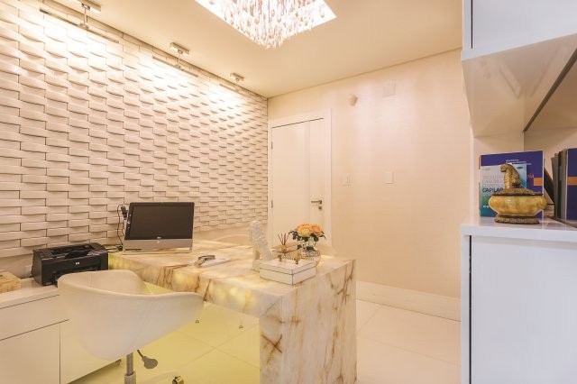 Para um consultório de dermatologia, na Dermato, o pedido da proprietária era deixar seu ambiente elegante e aconchegante para encantar seus pacientes. Pensando nisso, a designer deu destaque para a mesa do atendimento em mármore ônix. Esta peça encantadora, iluminada por baixo com fitas de led, foi executada com perfeição pela Maram. A poltrona da médica e as cadeiras interlocutoras são da loja Um Casa. “Outro detalhe que evidencia é a parede lateral do atendimento, com blocos de louça branca encontrados na Cerqueira Stylo, além do fino acabamento da marcenaria Hout Móveis”, salienta, contando que para complementar a decoração foram usados objetos da In!kaza, ressaltados com um arrojado luminotécnico.