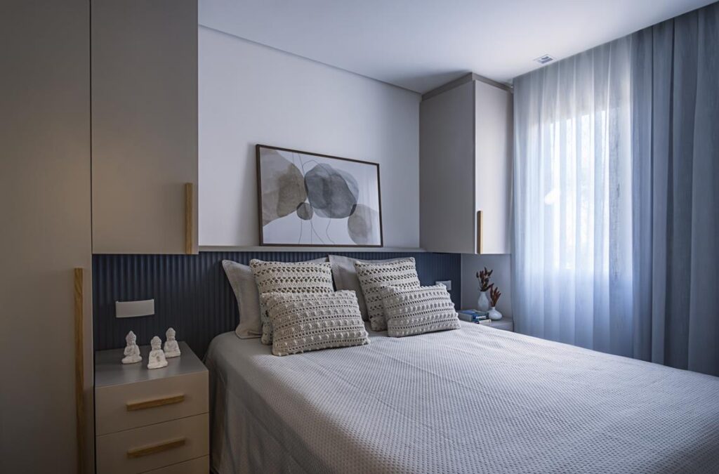 Um elemento de destaque em um quarto é a cabeceira e, é ela que dará o charme e o tom na decoração desse ambiente. Apesar dos tons neutros na suíte com9,30 m² e banheiro com 2,60 m² projetada pela arquiteta Debora Durigon, o quarto está longe de ser um espaço sem vida.