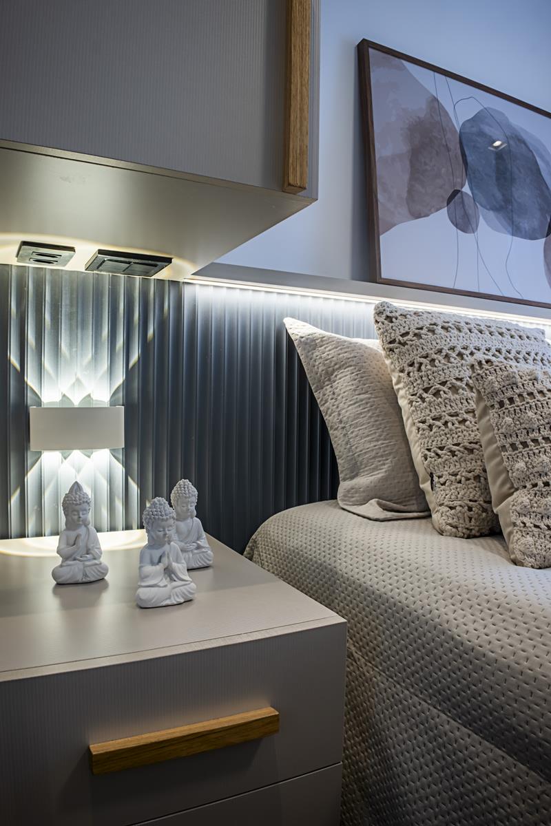 Um elemento de destaque em um quarto é a cabeceira e, é ela que dará o charme e o tom na decoração desse ambiente. Apesar dos tons neutros na suíte com9,30 m² e banheiro com 2,60 m² projetada pela arquiteta Debora Durigon, o quarto está longe de ser um espaço sem vida.