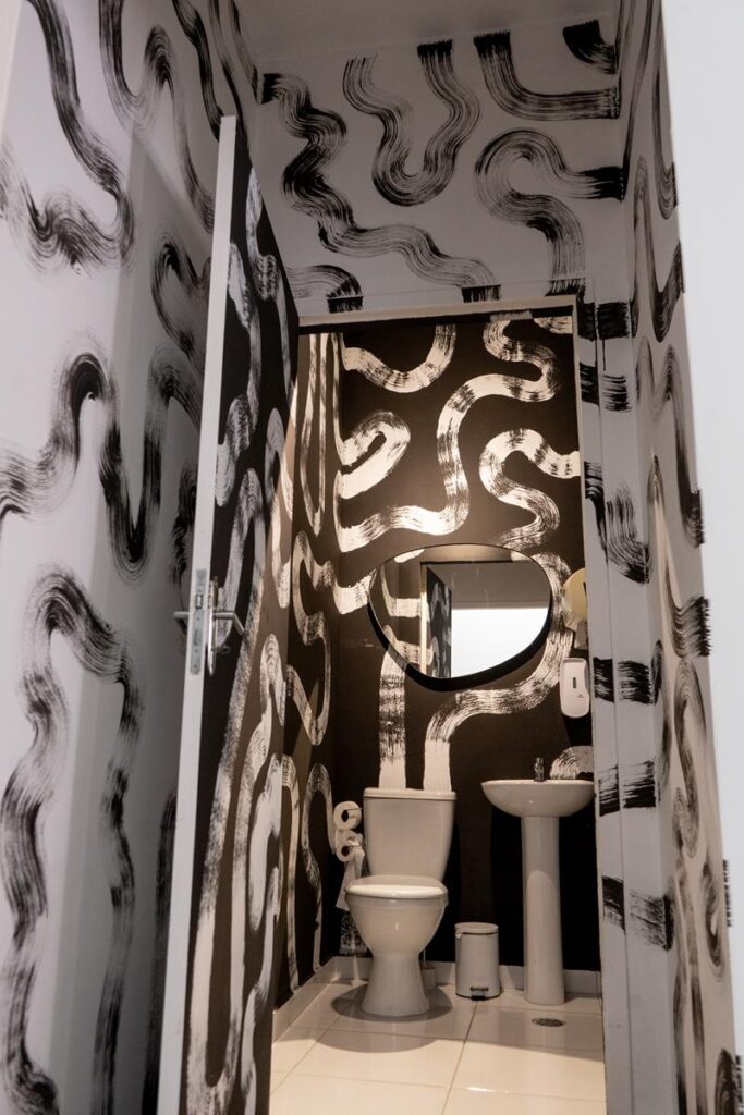 A atenção aos detalhes também aparece em soluções mais ousadas, como no banheiro. O hall de entrada recebe uma intervenção artística com formas orgânicas em preto sobre fundo branco. Ao atravessar a porta, o conceito se inverte: paredes pretas com pintura branca criam um contraste marcante e contemporâneo.