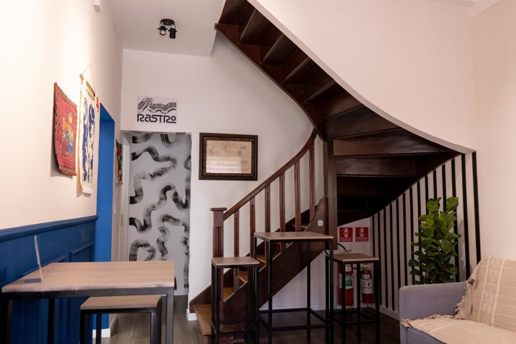 Outro elemento importante do projeto é a valorização de estruturas originais. A escada de madeira, restaurada, conduz ao piso superior e reforça o diálogo entre passado e presente.