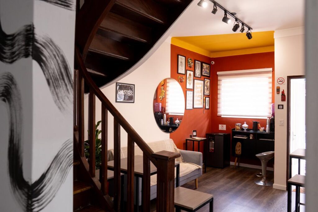No desenvolvimento do projeto, Camila buscou criar uma identidade alinhada ao entorno e ao mesmo tempo inovadora dentro do universo da tatuagem. “A proposta foi trazer a mesma identidade do próprio bairro, incorporando itens clássicos de uma casa dos anos 70, junto com detalhes mais contemporâneos, que também remetem à tatuagem”, explica a arquiteta.