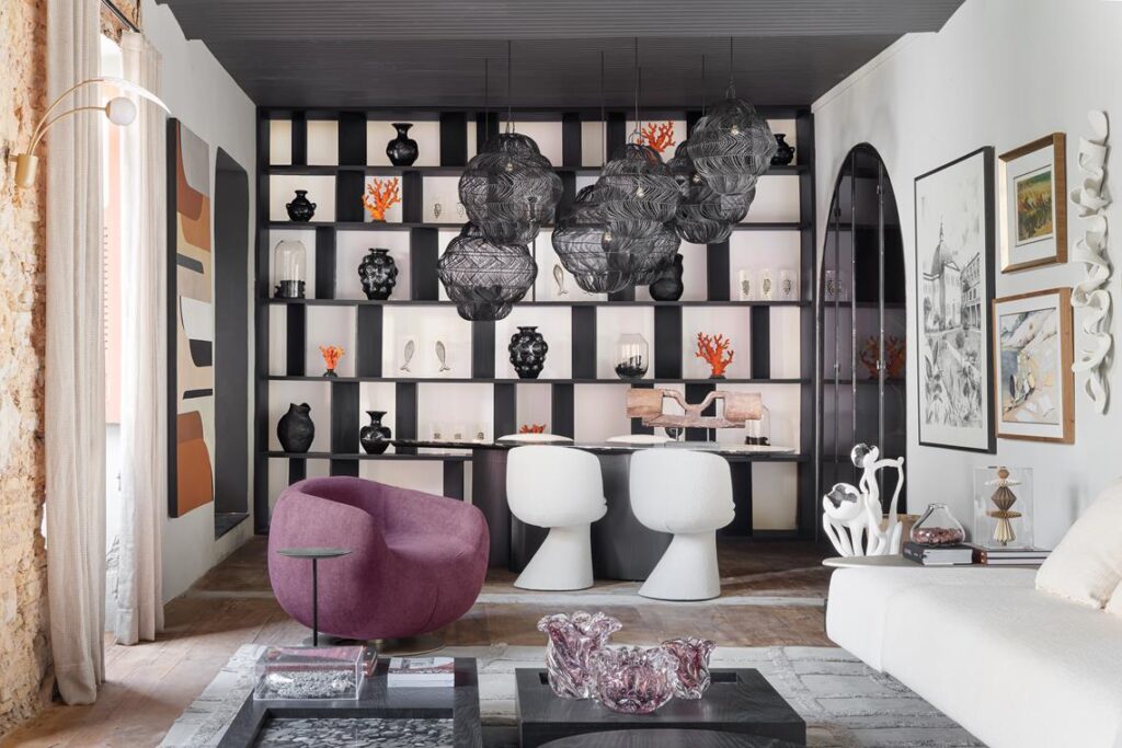 Inspirada por sua recente viagem à Feira de Design de Milão, Carol incorpora ao projeto elementos que traduzem o espírito contemporâneo e cosmopolita do design italiano: listras ousadas, espelhos, painéis ripados e uma composição que une sofisticação e rusticidade com equilíbrio. “Gosto da arquitetura que faz pensar, sentir, contemplar e até emocionar”, pontua. A iluminação foi pensada para valorizar cada detalhe do ambiente, permitindo que cada canto conte uma história e provoque sensações — como o vinho e a arte são capazes de fazer.