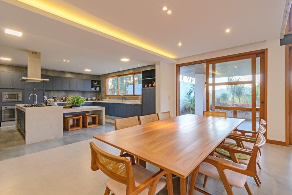 A sala de jantar, com sua grande mesa de madeira para oito lugares, se abre para a área externa através de painéis de vidro que vão do chão ao teto. A iluminação natural invade os espaços durante o dia, criando uma atmosfera viva e dinâmica. À noite, o projeto luminotécnico ganha protagonismo, com um belo lustre de seis pendentes circulares no hall e trilhos com spots pretos que destacam texturas e volumes por toda a casa.