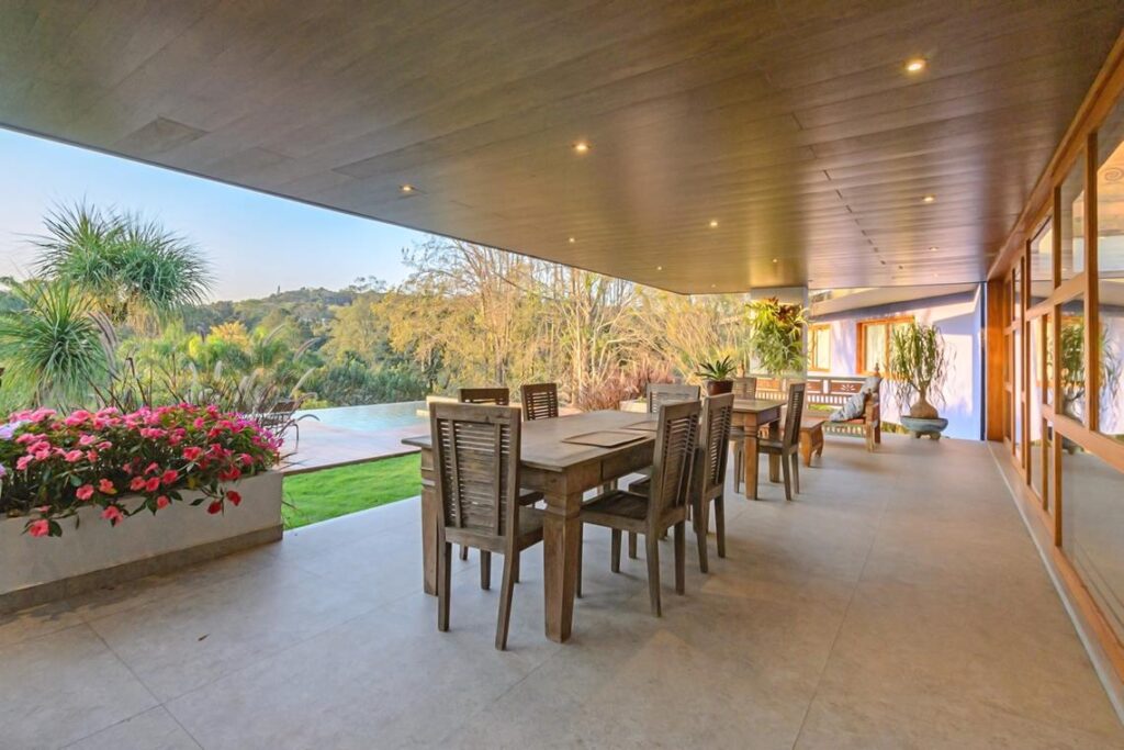 Mesas rústicas de madeira proporcionam o espaço ideal para encontros ao ar livre, com vista para o deck de madeira e a piscina, de onde se pode apreciar uma paisagem deslumbrante. A sauna completa a proposta de bem-estar da casa, oferecendo um verdadeiro spa privativo aos moradores.