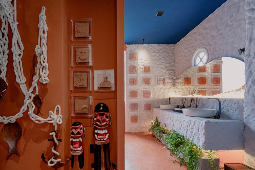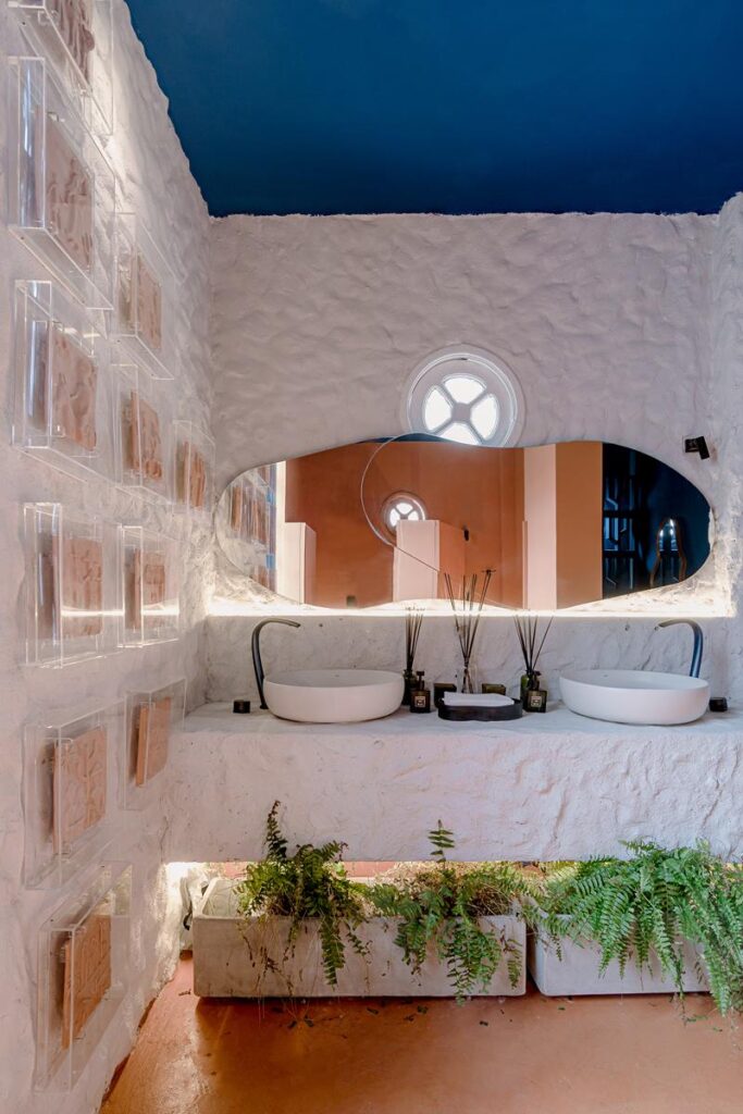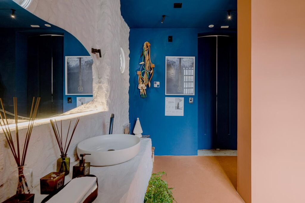 Entre o sertão e o mar, o Lavabo Terra e Sal, assinado por Andressa Mâtos, traduz em arquitetura a própria história da profissional, que tem raízes no Vale do São Francisco e uma conexão especial com Salvador. O projeto une permanência e movimento, calor e frescor, criando um espaço sensorial e poético. Paredes e piso em cimento queimado terracota remetem ao solo árido do sertão, enquanto teto e paredes azuladas evocam o mar e a arquitetura popular baiana. A bancada de simples e ao mesmo tempo forte em sua rusticidade, se une a elementos marcantes como carrancas, cobogó em formato de mandacaru, esculturas de barro e cordas náuticas, conectando assim dois biomas e contam histórias. Mais que funcional, o lavabo é um convite às lembranças e ao pertencimento.
