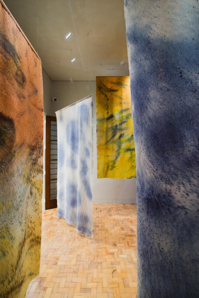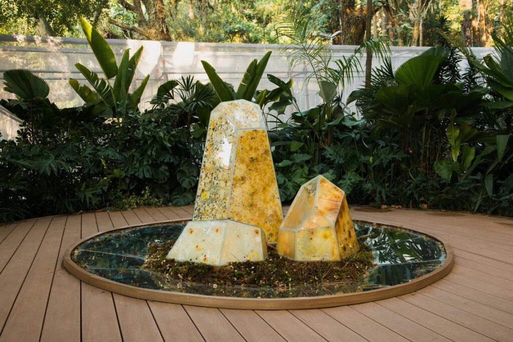 Entre os destaques está “O Avesso da Terra”, uma instalação viva da artista Bruna Mayer, que abriga, em recipientes de vidro com iluminação interna, microrganismos coletados do corpo da própria artista e do parque. A obra cria um microclima em constante transformação, revelando a simbiose entre corpo e natureza ao longo da mostra. Já Juliana dos Santos, com a obra “Dois Tempos”, apresenta lonas pigmentadas com elementos orgânicos e minerais que se oxidam e se transformam, refletindo poeticamente a passagem do tempo.