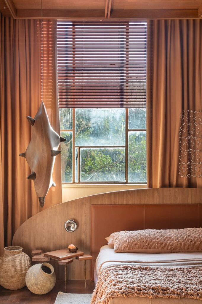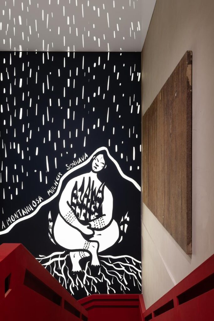 A ancestralidade ganha destaque no ambiente assinado por Pedro Coimbra, com o mural da artista indígena Yacunã Tuxá, que traz a potente frase “A montanhosa mulher sonhava”. A obra se integra à instalação sensorial, onde arquitetura, memória e arte se entrelaçam em uma experiência de contemplação e deslocamento do olhar.