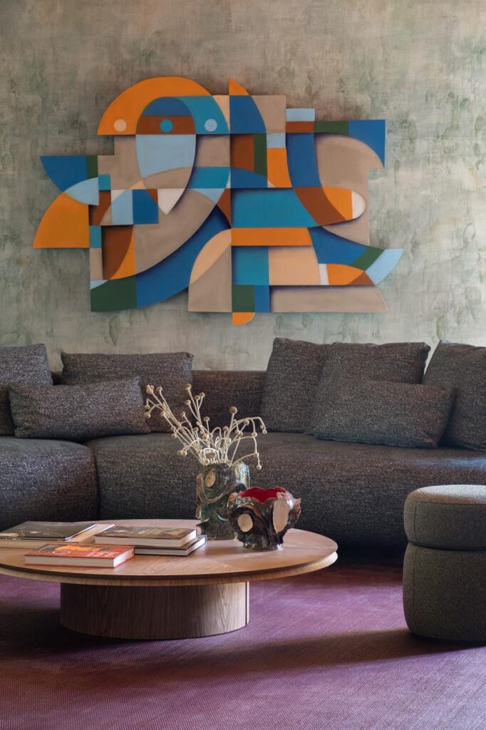 O Rodra Arquitetura expõe uma pintura de Vasarely, compondo um mosaico visual que transita entre o renomado e o afetivo, enriquecendo o Estúdio Potiguar com sua presença icônica.