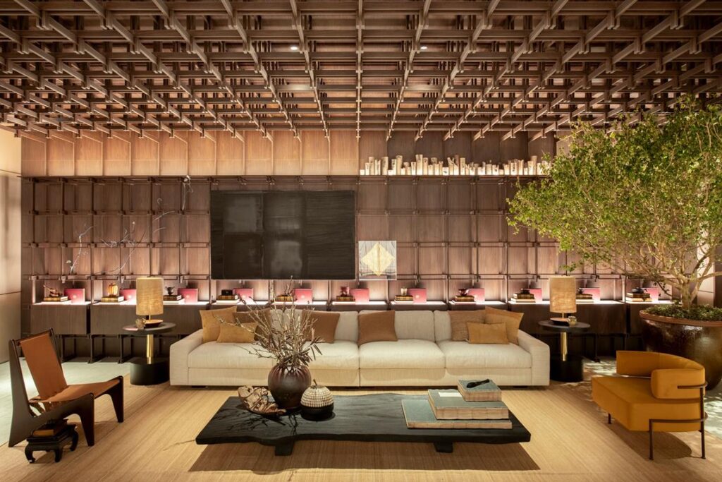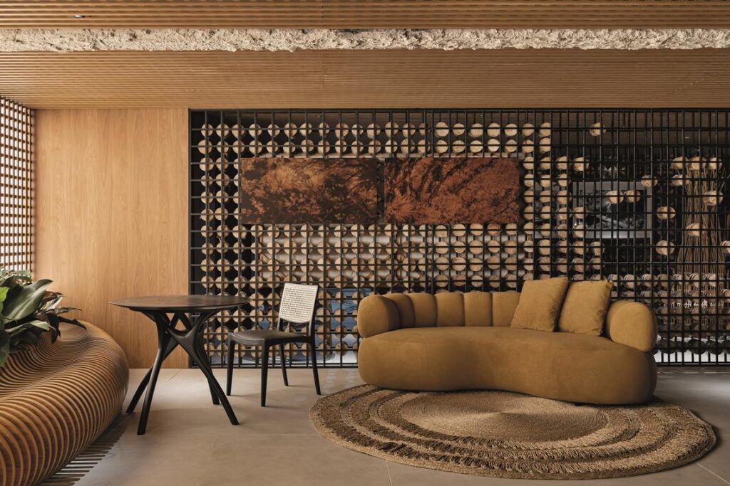 No ambiente Sopro, da arquiteta Beatriz Quinelato, a escultura “Seres”, de André Ferri, mistura madeira e cerâmica em uma criação de potência transcendental.