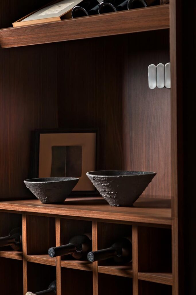 Na Adega Legado, projeto do arquiteto Gabriel Rosa, a cerâmica de Lilian Malta ganha papel sensível em um ambiente que celebra o tempo, a ancestralidade e a estética negra com sofisticação e simbolismo. Integrando o conceito Black Dandy, o espaço é marcado por uma paleta intensa e texturas refinadas. As peças cerâmicas contribuem para essa narrativa ao evocarem memória e permanência, como pequenos altares visuais que sustentam a poética do espaço.