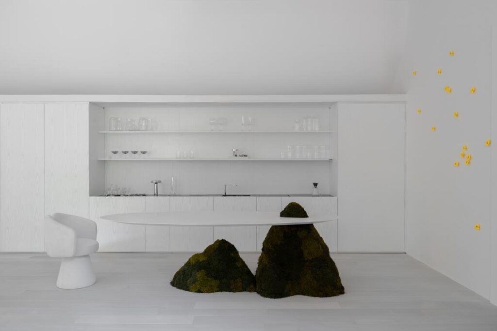 Natan Gil, no ambiente Sussurros das Montanhas, apresenta flores do artista Mauro Piva que parecem brotar das paredes, como poesia viva inserida no espaço arquitetônico.