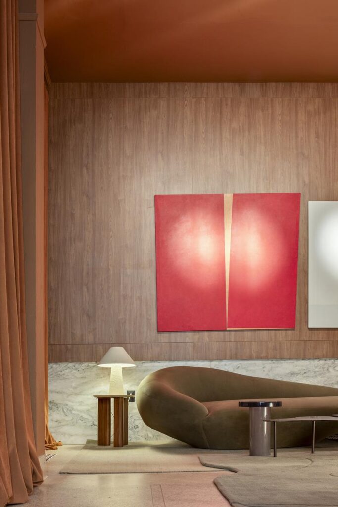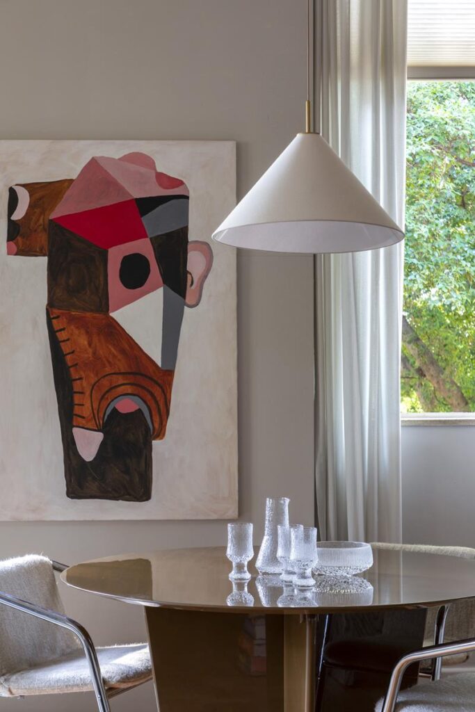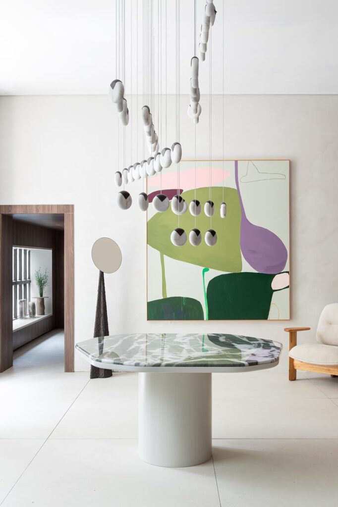 A Casa Toushi, de Bruno Carvalho, ganha expressão com uma pintura da artista Célia Euvaldo, da Galeria Simões de Assis. A obra traz uma gestualidade silenciosa que ecoa equilíbrio e fluidez por todo o ambiente.