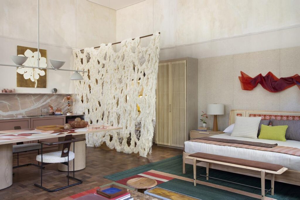 Já no Loft Alvorá, assinado por PN + | Paula Neder, a obra têxtil de Pat Lobo entrelaça linho, feltro, algodão e cerâmica em uma coleção poética que costura tempo, sonho e matéria.