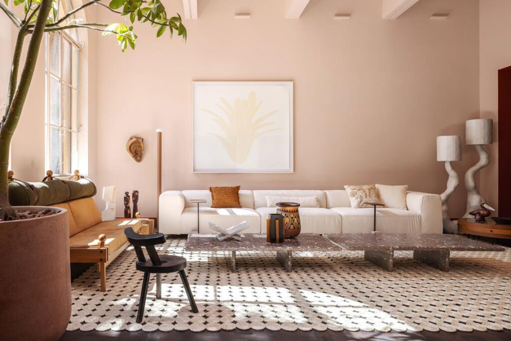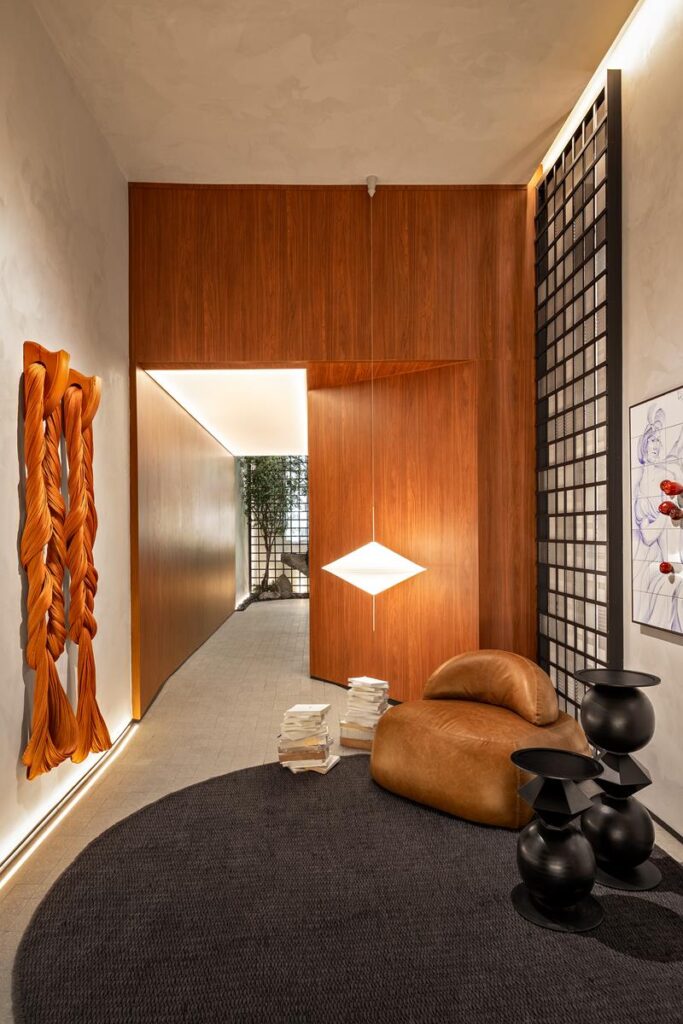 Na Casa Paulistana, João Panaggio, com curadoria de Lurdinha Piquet, apresenta uma escultura em madeira de cajacatinga do artista Marcelo Silveira, que cria um ponto de transição entre os espaços, unindo arte e arquitetura de forma orgânica.